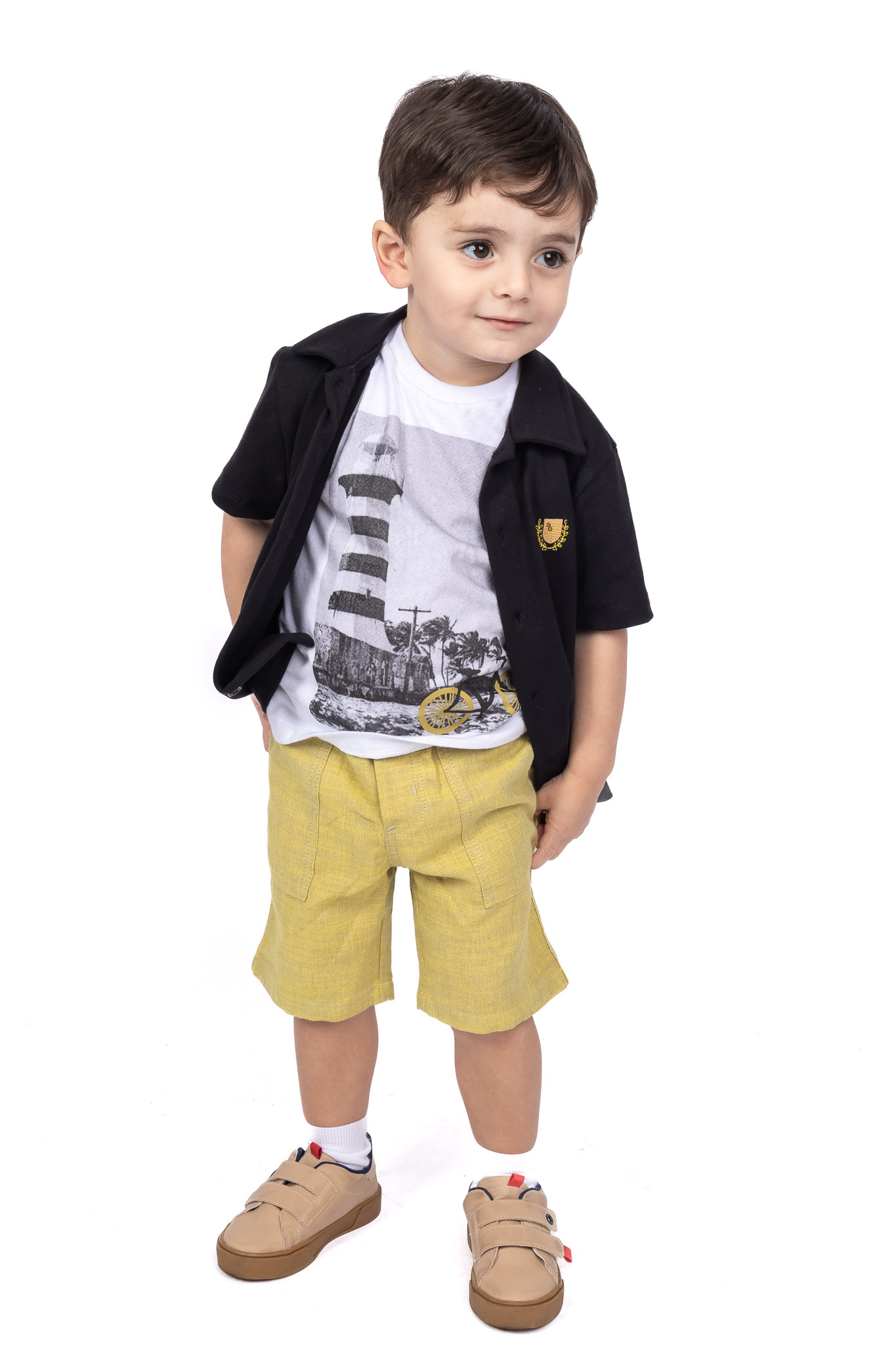 Bermuda 70% Algodão 26% Modal 4% Linho / Camisa 95% Algodão 5% Elastano / Camiseta 100% Elastano